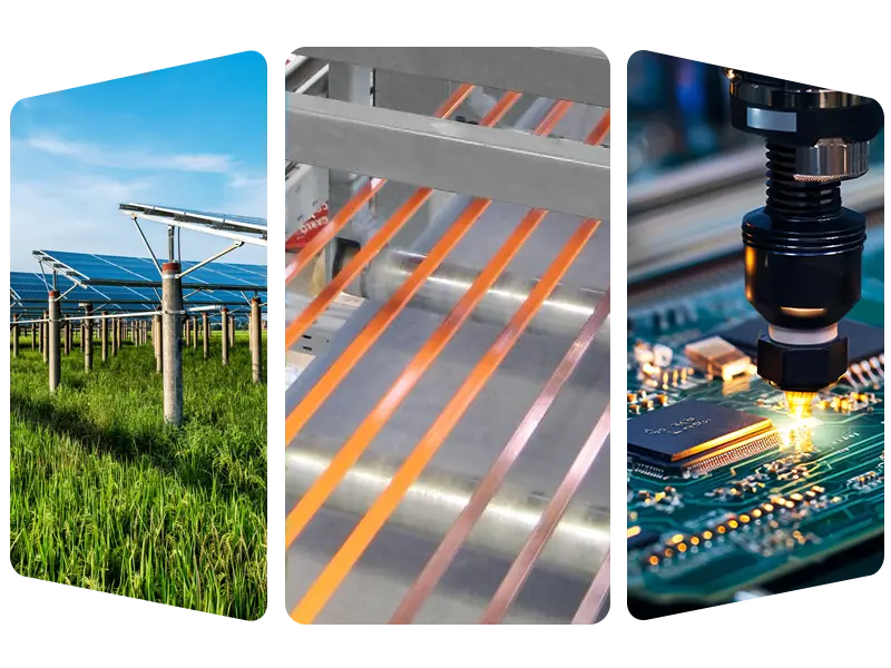 • Fotovoltaické pole: hromadná výroba fotovoltaických zváracích pások a prípojníc, ktoré pomáhajú komponentom viesť elektrinu efektívne.